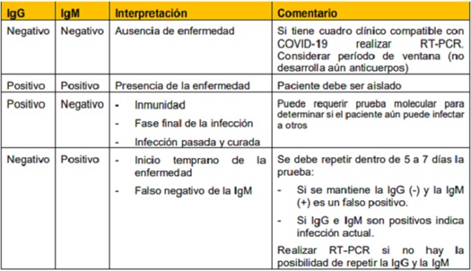La detección de anticuerpos en muestras de sangre total o capilar se basa en la presencia de anticuerpos tipo IgM e IgG. Los anticuerpos detectados por esta prueba indican que la persona tiene una respuesta inmune al SARS-CoV-2, aunque la infección fuera asintomática. No requiere de equipos especiales, es sencilla de realizar y más económica que la prueba molecular. IgM se puede detectar alrededor del día 5 (3-6 días), mientras que la IgG se detecta en 14 días (10-18 días) después del inicio de los síntomas. La sensibilidad de la prueba aumenta significativamente (98,6%) cuando se combina la IgM con PCR para cada paciente en comparación con una sola prueba (Guo L, 2020).