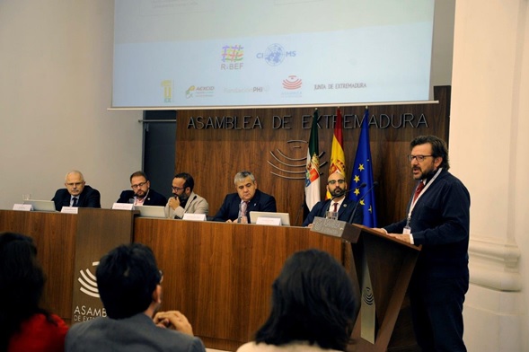 Dr. Adrian Llerena presentando los resultados de RIBEF en la Asamblea de Extremadura frente al Dr. Lembit Rägo (Secretario General de CIOMS, Suiza), Sr. Miguel Ángel Morales (vicepresidente primero de la Asamblea de Extremadura); Sr. Antonio Rodríguez Osuna (alcalde de Mérida); Dr. Antonio Hidalgo (Rector Universidad de Extremadura) y el Sr. Ángel Calle (director de la Agencia Extremeña de Cooperacion Internacional).