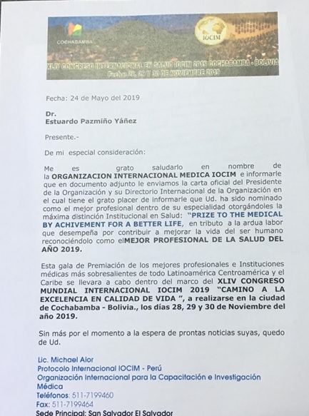 El Directorio Internacional de IOCIM, Organización Internacional Médica, que tiene su sede principal en San Salvador, ha nominado al Dr. Estuardo Pazmiño Yánez como mejor Profesional dentro de su especialidad, otorgándole la máxima distinción institucional en salud PRIZE TO THE MEDICAL BY ACHIVEMENT FOR A BETTER LIFE, en tributo a su ardua labor y por contribuir a mejorar la vida del ser humano, reconociéndolo como el MEJOR PROFESIONAL DE LA SALUD DEL AÑO 2019.